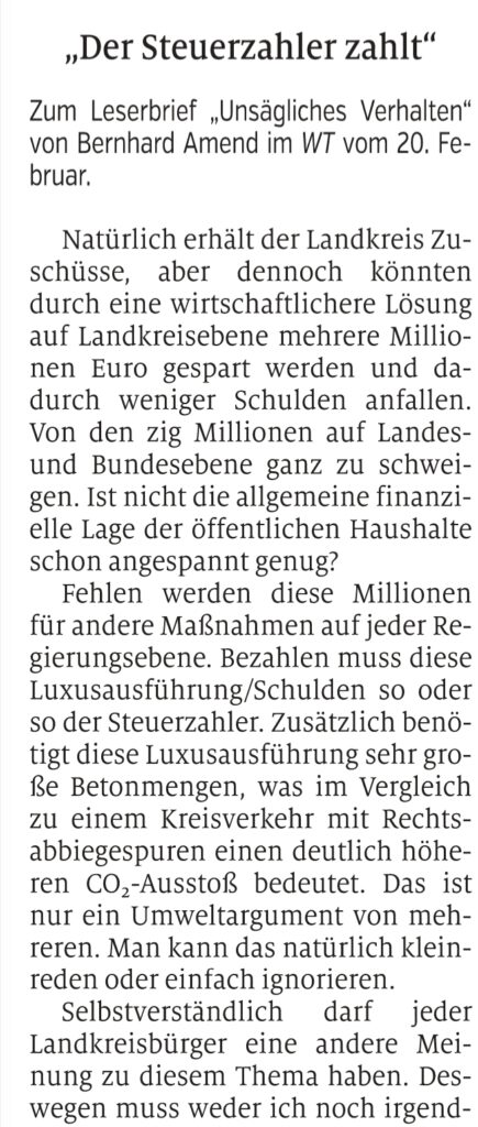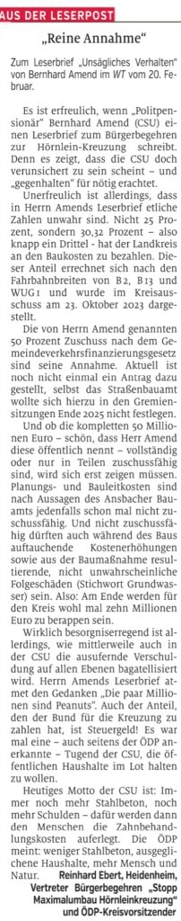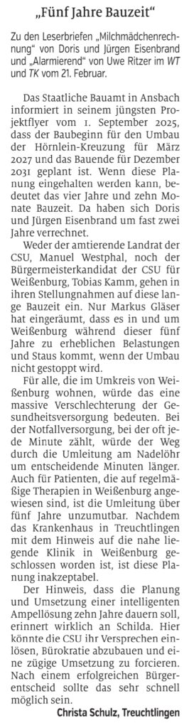 Folgender Leserbrief von Christa Schulz aus Treuchtlingen erschien am 25. Februar 2026 im Weißenburger Tagblatt. Sie hat uns freundlicherweise erlaubt, ihn hier zu veröffentlichen: